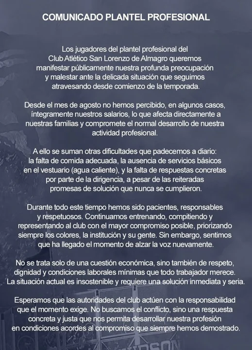Los jugadores de San Lorenzo emitieron un contundente comunicado en el que expresaron su «preocupación y malestar» y enfatizaron que «ha llegado el momento de alzar la voz».